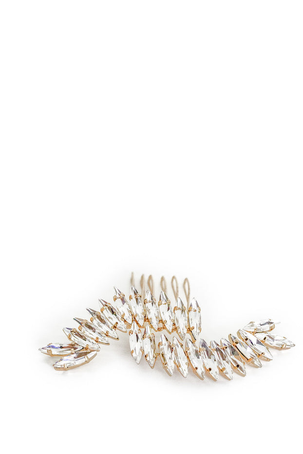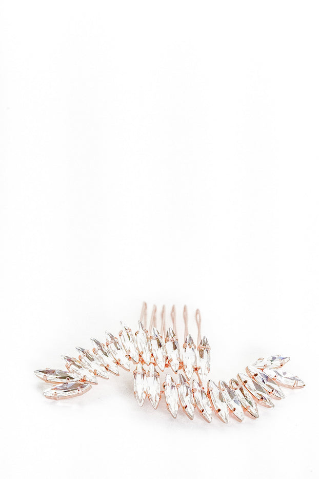 IDALIA COMB - STYLE 2404 A beautiful and intricate comb designed to adorn any hair style. Available gold and silver Made with sterling silver and plated with 14 k gold vermeil. Hand wired marquise crystals Adornment measures 2 x 1 inches Can be worn in any position on the head...