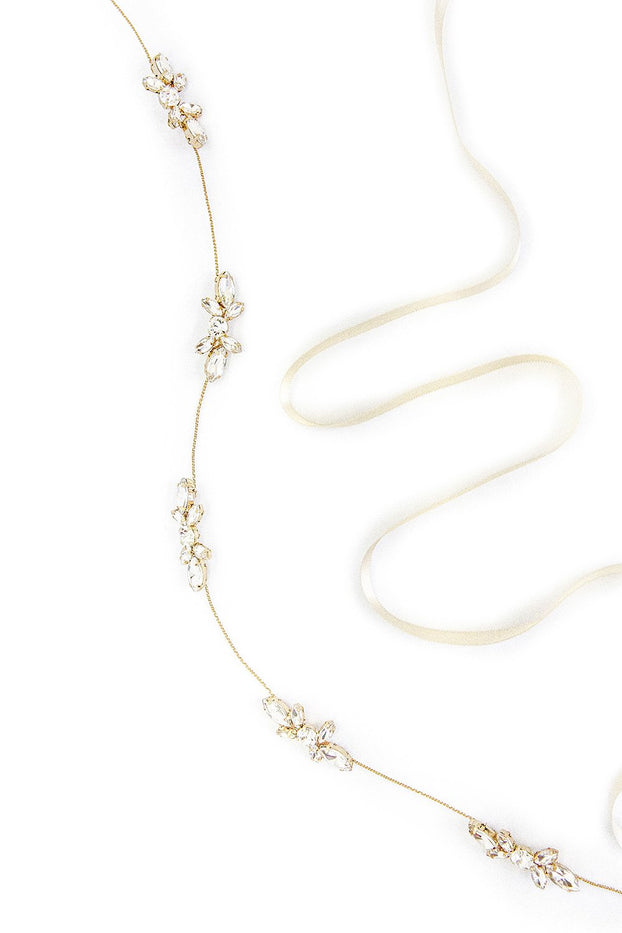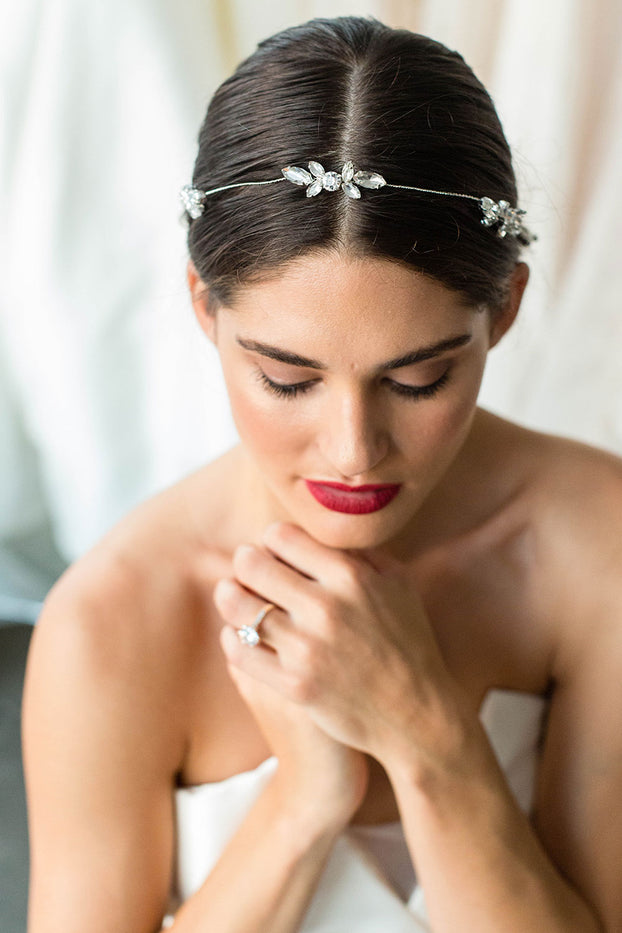 Our exquisite Aubree halo almost wraps around the head worn with an updo or half up do, or weaved through a braid or half down hair style.