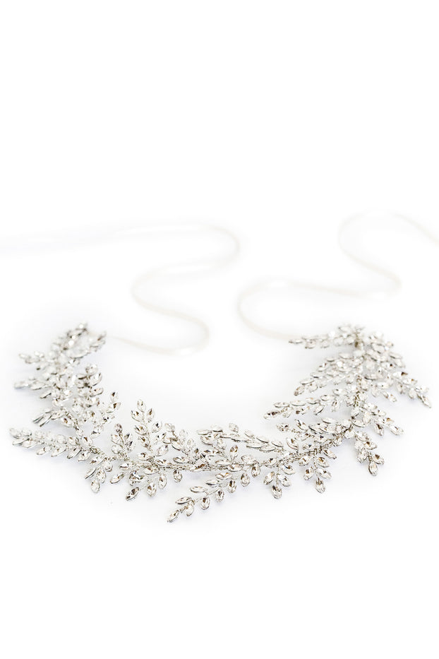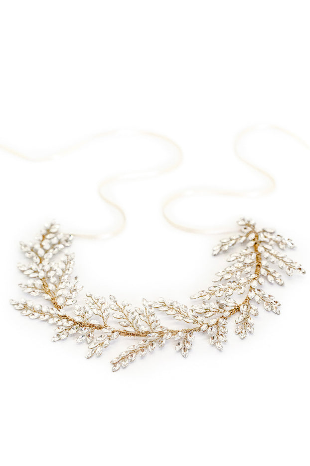 Leaf clustered sparkling marquise crystals created to embody a regal design.
