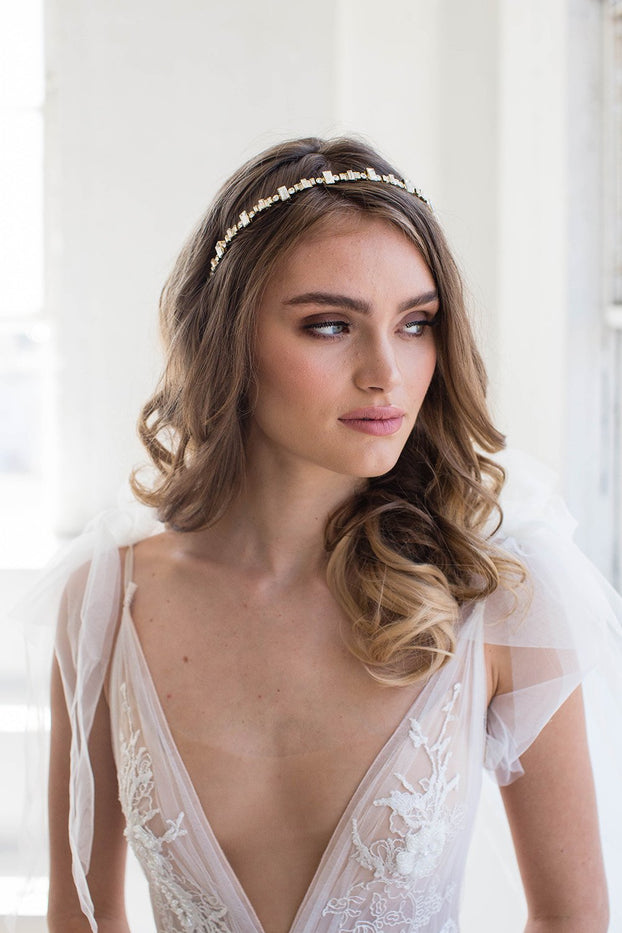 Our modern and elegant crown/tiara designed to fit on the crown. This is stunning featuring Swarovski baguette crystals.