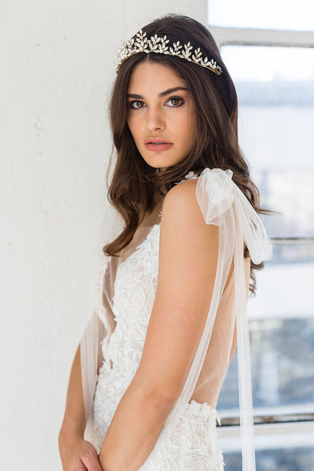 ACACIA CROWN - STYLE 1429 Our elegant crown/tiara design will make a statement on your special day. Hand-wired with Swarovski marquise crystals and freshwater pearls. Available in silver and gold Hand made using sterling silver and plated in 14k gold Hand-wired marquise crystals and freshwater pearls Adornment measures 14 inches...
