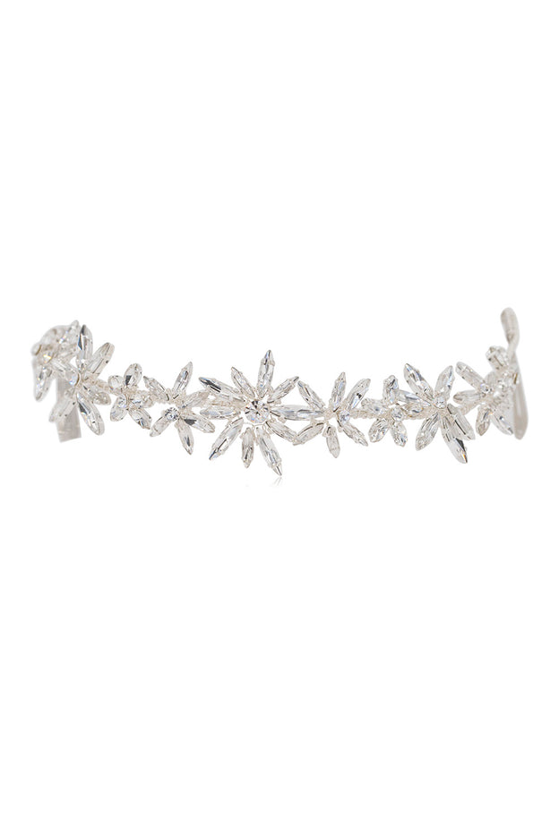 A delicate and elegant crown/tiara designed to fit on the crown and the back of the head. This is a subtle yet truly a statement headpiece with marquise stones and crystals.