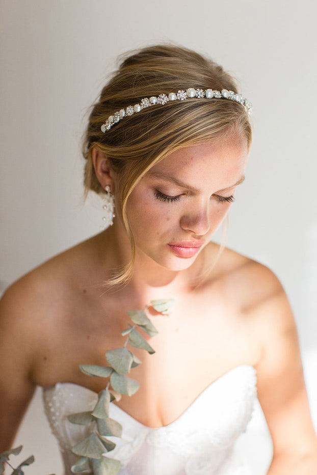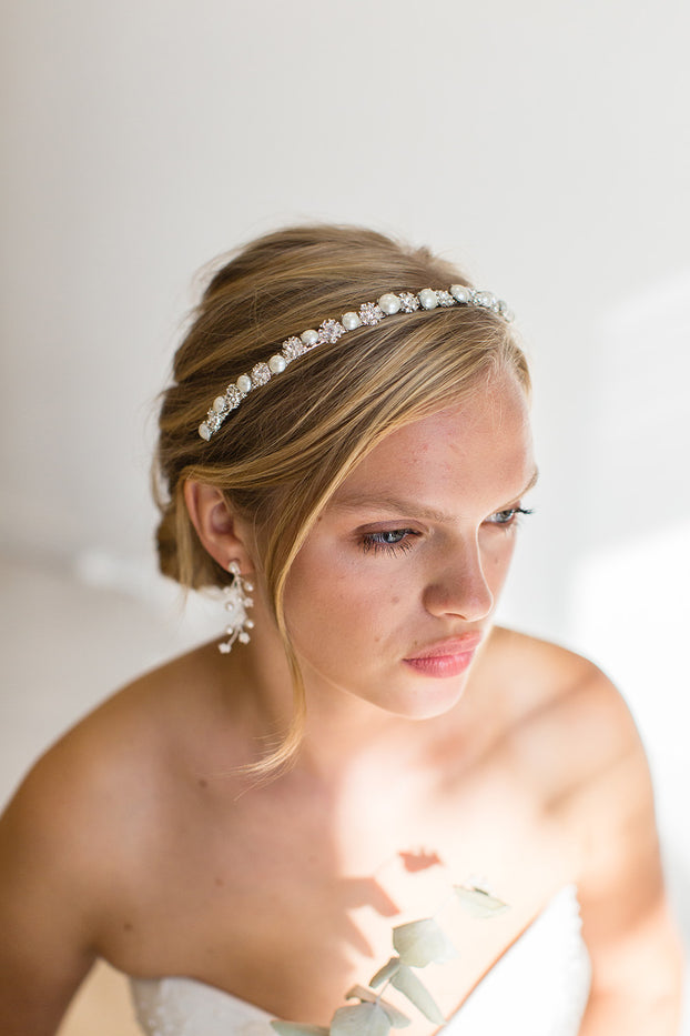 PARTHENA HEADBAND - STYLE 5034 Available in silver Handmade using sterling silver Hand-wired with Austrian crystals and faux pearls Lightweight Hypoallergenic: Nickel, cadmium and lead free Item ships in signature keepsake packaging